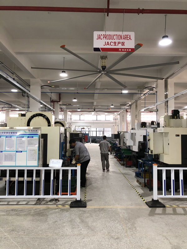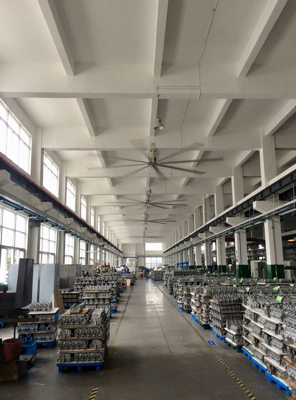 我公司生產的大型工業吊扇直接懸掛在廠房屋梁下,風力柔和,能加快車間空氣流通,有效降低車間內溫度,改善車間空氣環境質量,有利于員工的身體健康。